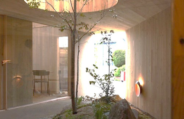 店内は木の香りが漂う国産材で包み込まれたカフェ空間。そこには、国内の彫刻家が作るテーブルや椅子、またデンマークの照明、家具、アートも彩られ豊かな時間を過ごすことができます。 光の井戸がある中庭を中心に設けられた二つのお部屋からカフェを愉しむ空間構成。そこにはウチ・ソトが連続し自然の中にいるような不思議な感覚へ導きます。それもCLTパネルの自然素材が持つ力を最大限に利用した計画として、訪れた人々に良い違和感を与えています。 |